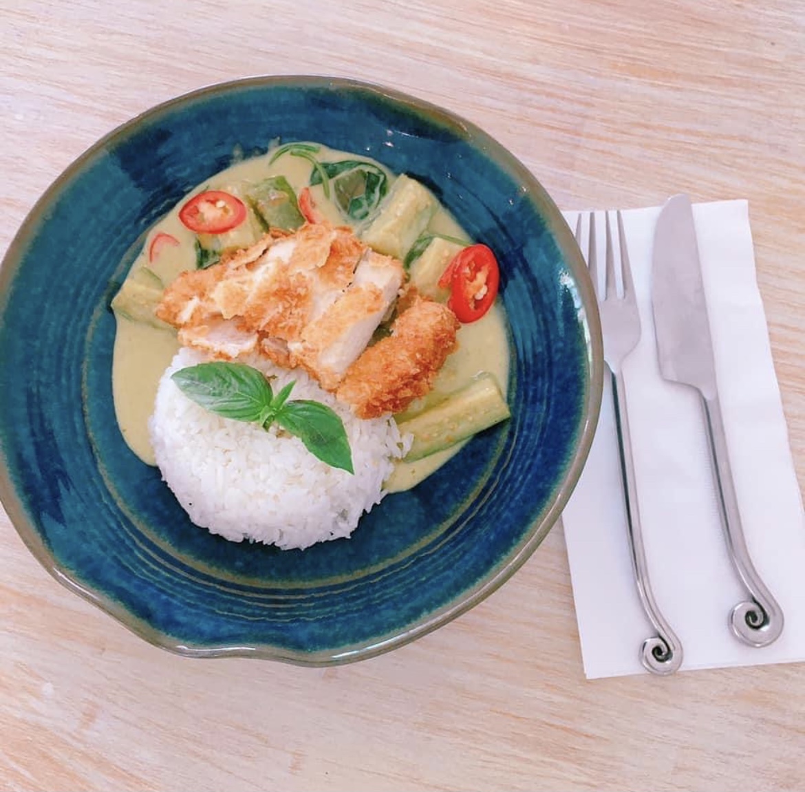 Egg Plant Green Curry with Chicken Tonkatsu served with Streamed Jasmine Rice