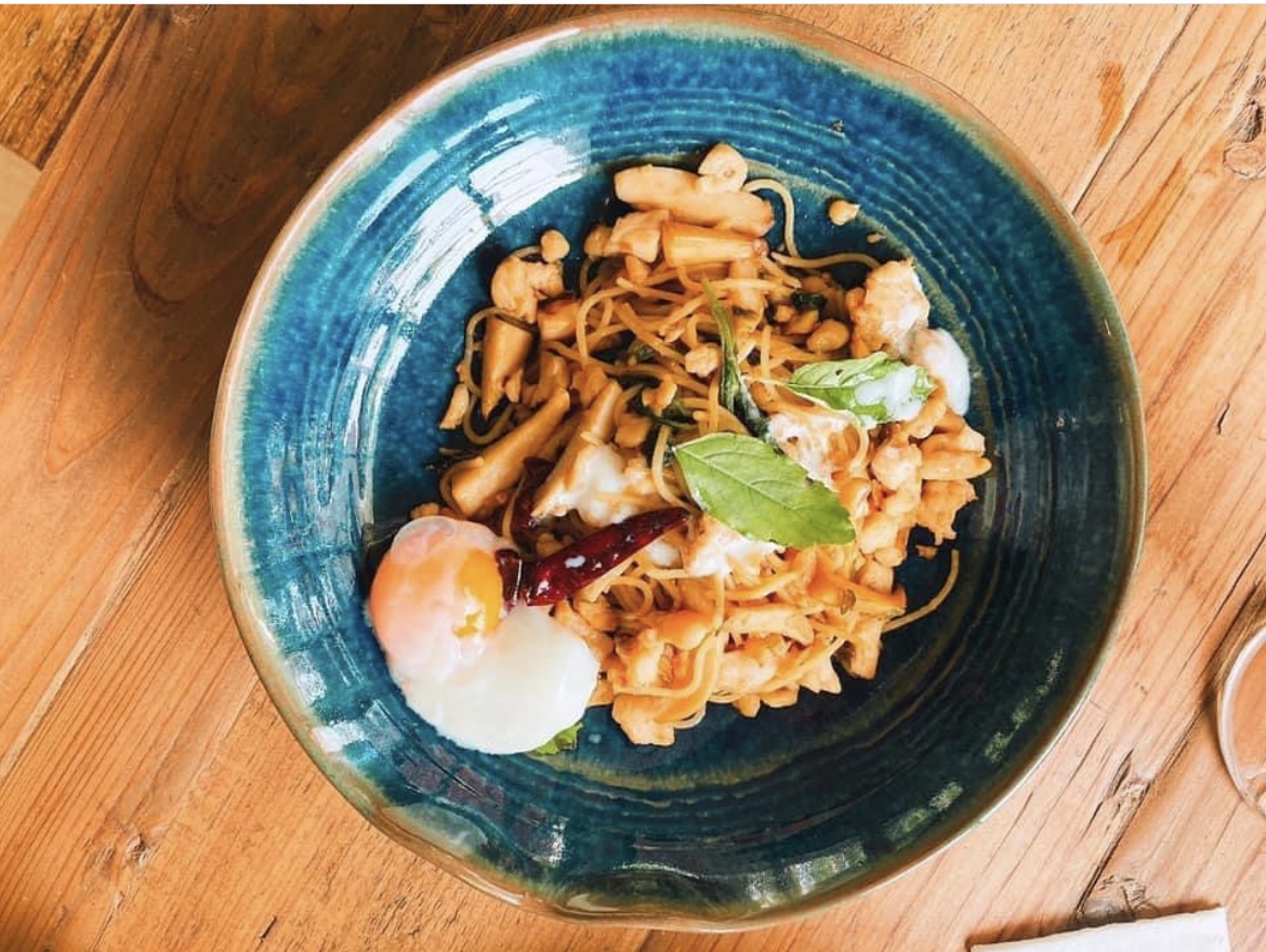 สปาเก็ตตี้กระเพราไก่ เห็ดเอริงงิ พริกแห้ง และไข่