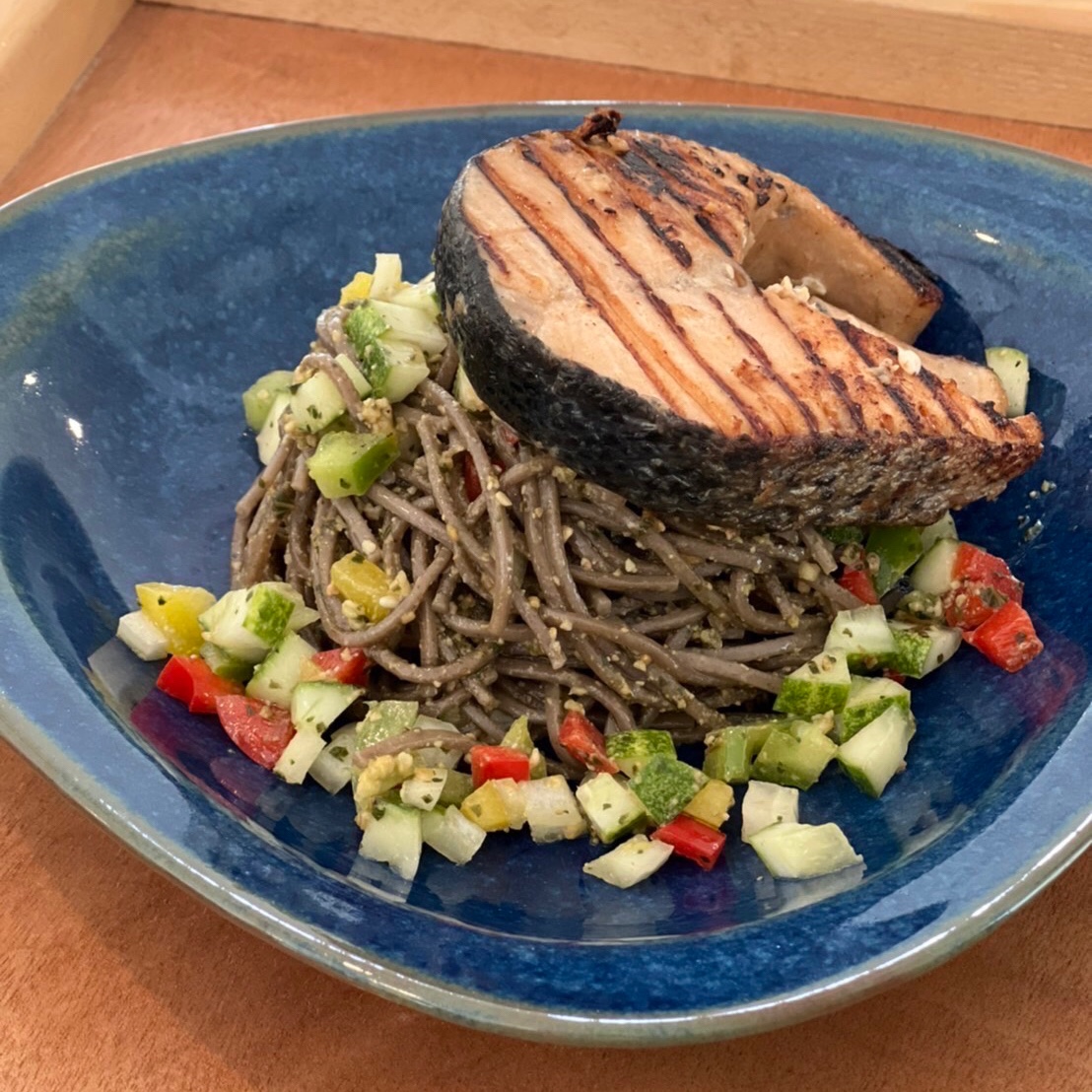 Soba pesto salad and grilled salmon