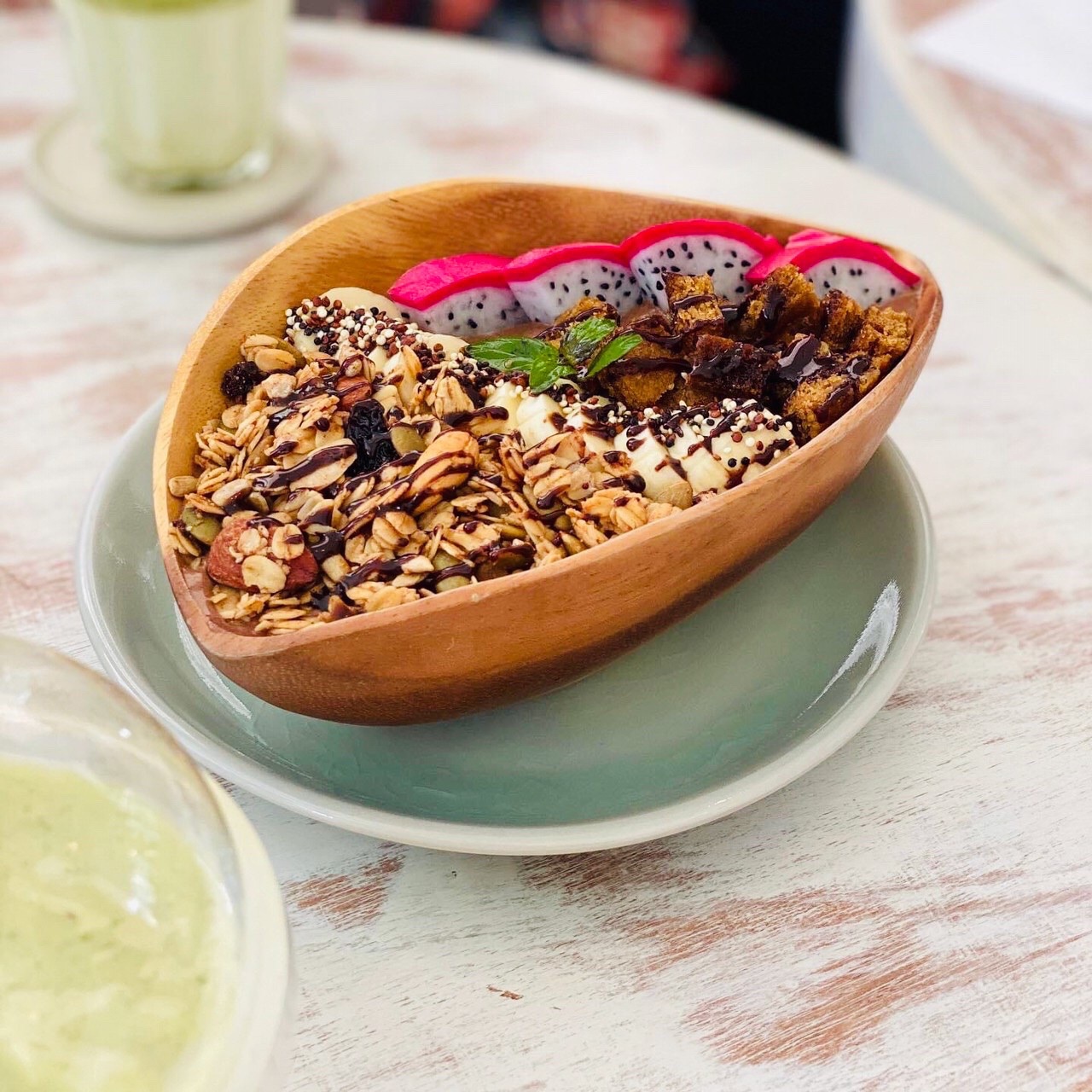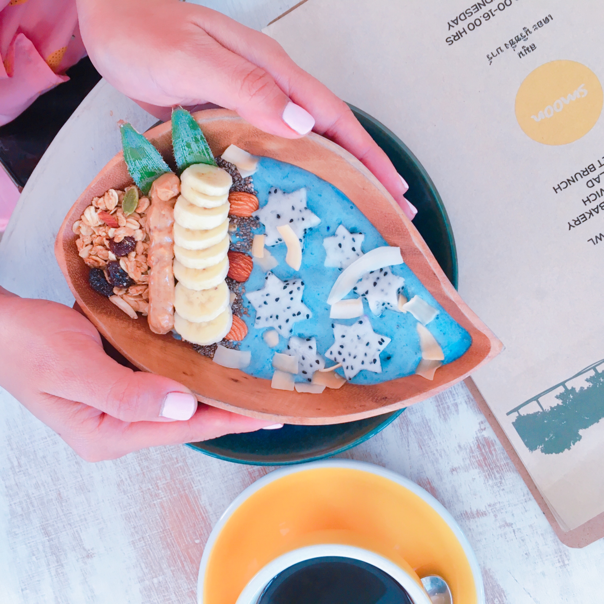 Blue Spirulina,Banana,Almond milk,Granola,Chia seed)